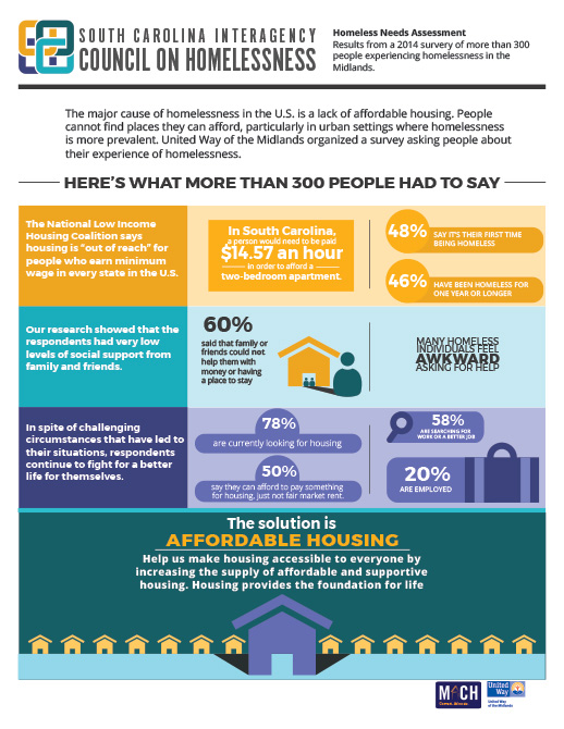 The major cause of homelessness in the U.S. is a lack of affordable housing. People cannot find places they can afford, particularly in urban settings where homelessness is more prevalent. United Way of the Midlands organized a survey asking people about their experience of homelessness.