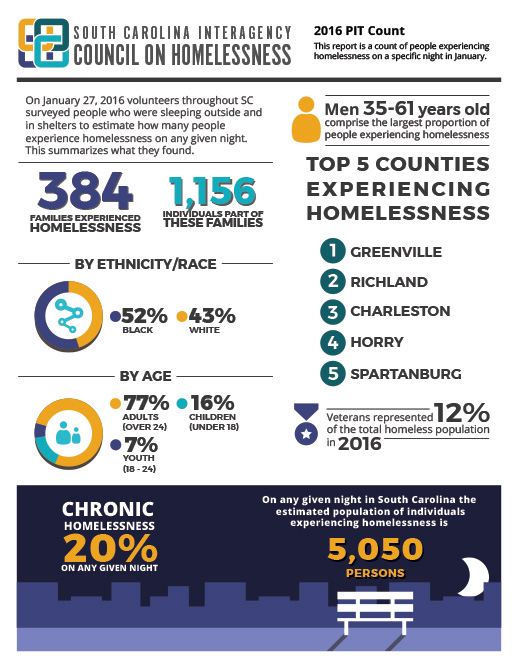 Every year, the US Department of Housing and Urban Development (HUD) requires communities to count people experiencing homelessness on a specific night in January. The information is analyzed and compiled into a single report for SC by researchers working with each local CoC.