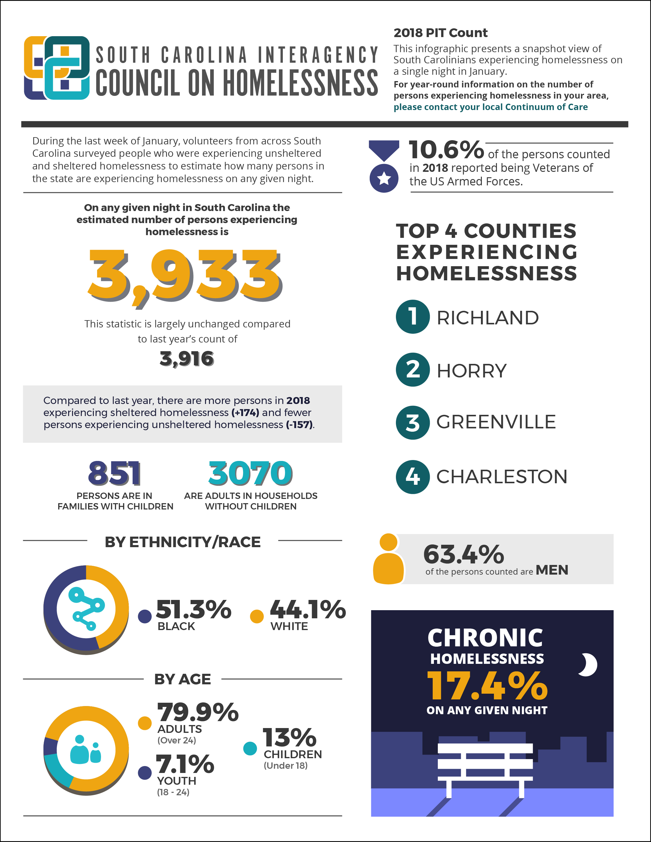 Every year, the US Department of Housing and Urban Development (HUD) requires communities to count people experiencing homelessness on a specific night in January. The information is analyzed and compiled into a single report for SC by researchers working with each local CoC.