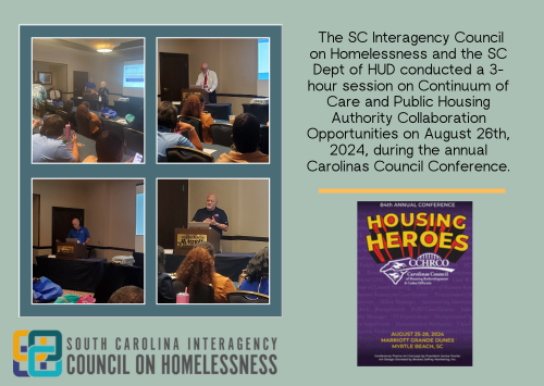 On August 26, 2024, representatives from SCICH, and the SC Regional Office of the Dept of HUD presented a 3-hour session on how Continuums of Care (CoCs) and Public Housing Authorities (PHAs) can come together in collaboration to house more of our SC citizens who experience homelessness and housing insecurity.